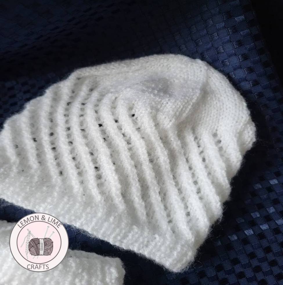 A set of handknit baby christening pieces. Including a hat, mittens and booties.