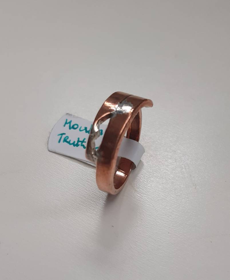 I like to say that there is no waste in my workshop and this ring epitomises that! This was a piece of copper left over from another piece so I crossed it over itself, giving this 'mouth', and soldered it into place.