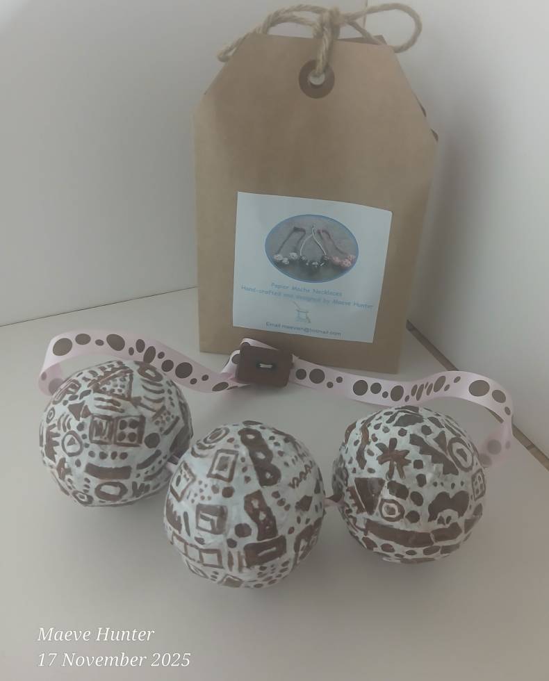 Every large bead is crafted with nine layers of papier mâché, shaped, dried, and the form inside is carefully removed to create a lightweight yet durable form.