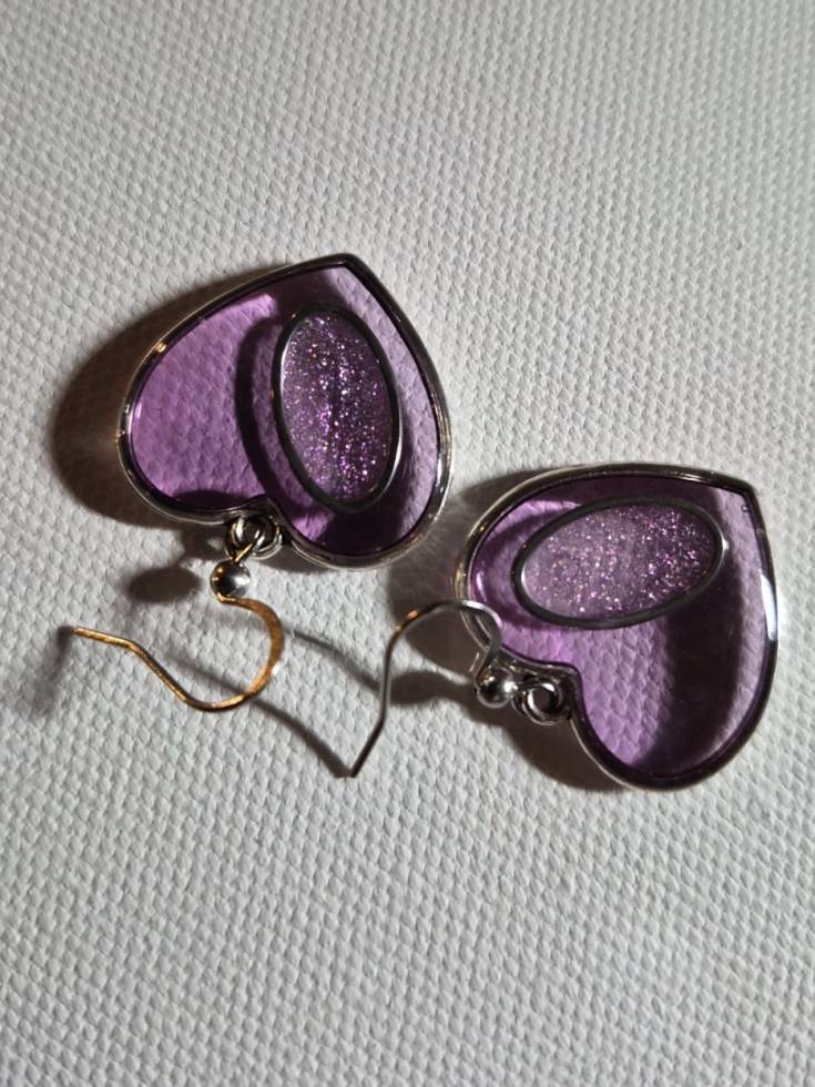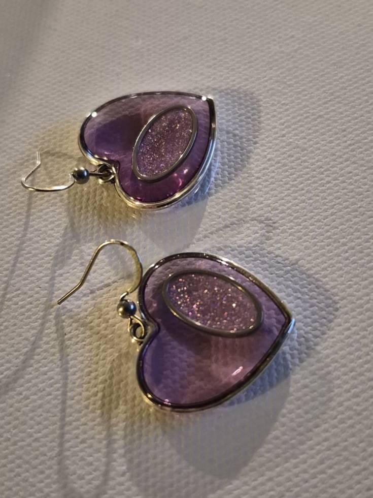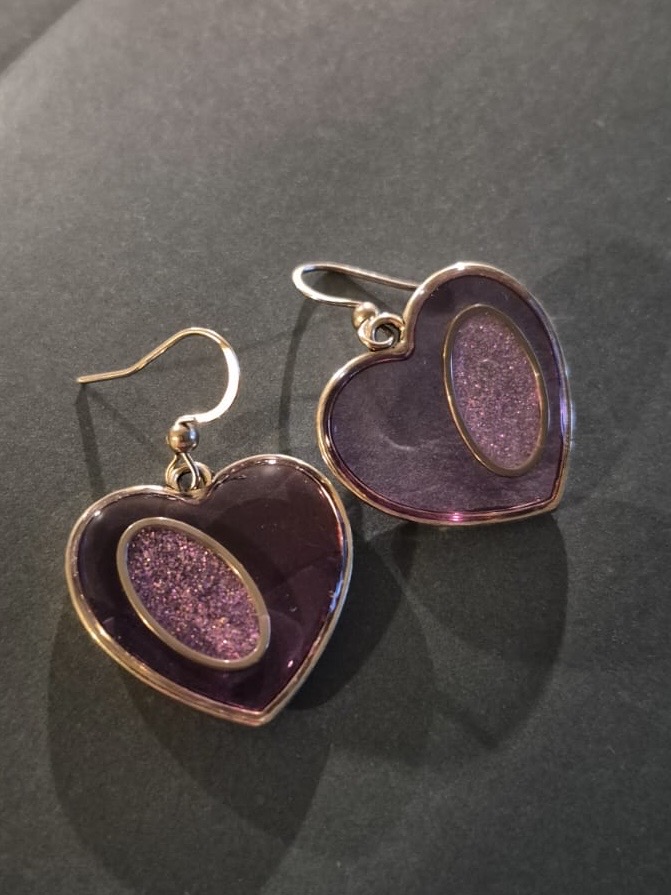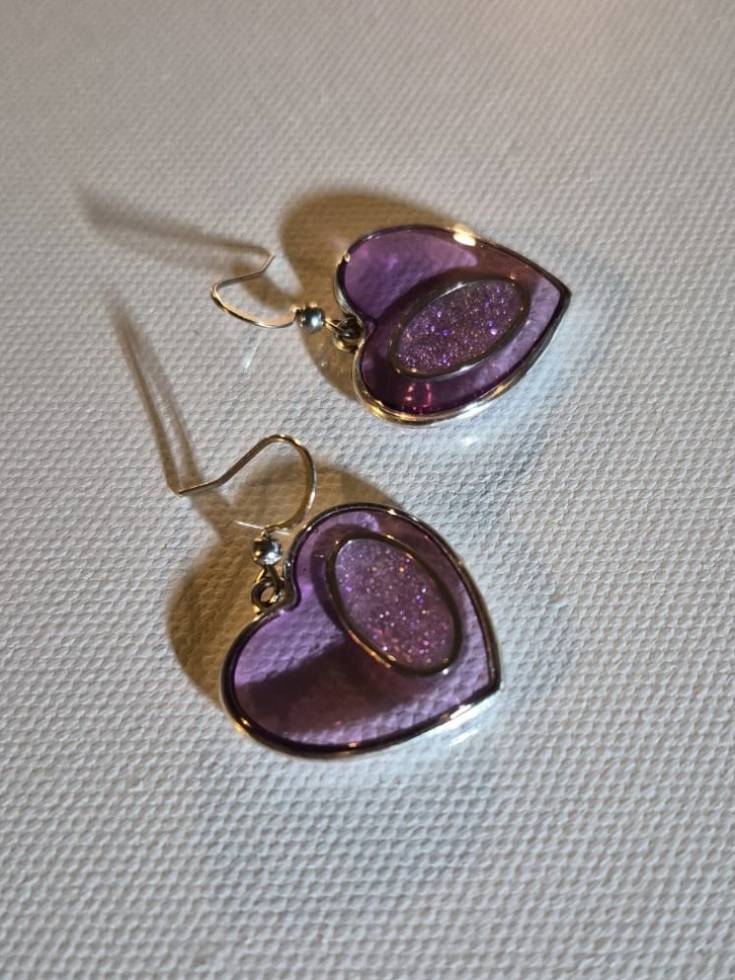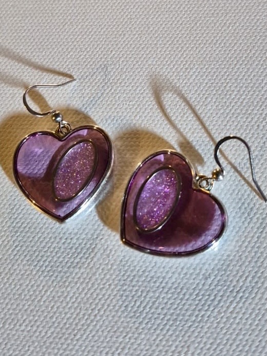 Inside each heart is a handmade inset with purple sparkle resin.