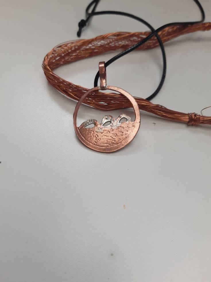 This pendant, Rolling Waves, was inspired by some swimmin' women I know! The waves are pierced out of the circular piece (3cm diameter) depicting waves and silver dust is fused with the copper to denote the foam - of which there is a lot on a blowey day. And no two pieces are the same - sometimes my waves are less turbulent.