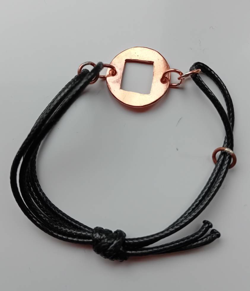 I love waxed cord and it goes very well with copper. My Shapes cord bracelet comprises a circle of copper from which a square-ish shape is pierced. I also made my own copper jump rings using the copper wire I have been so lucky to be given.