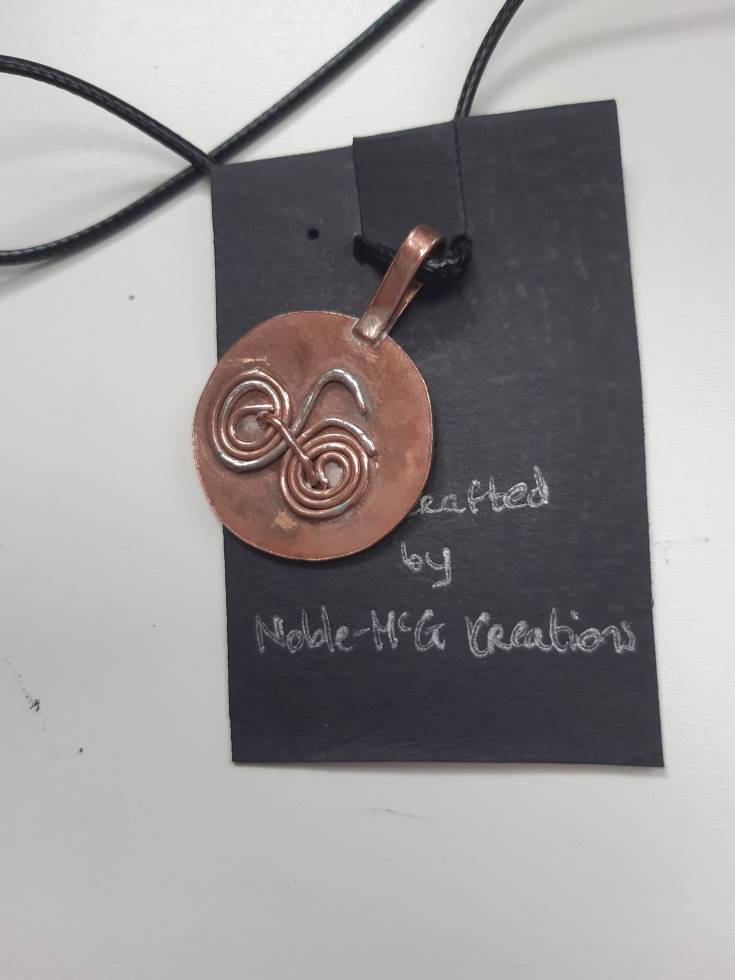 This Tour de France pendant has a story. The wire that was used on this piece was found by a dedicated beach cleaner on the Wild Atlantic Way! So I decided to use it to depict an activity popular along that route - cycling. And the name just fit. Copper wire is soldered into place, a waxed cord is the other important component.
